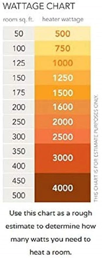 3. Refer the wattage chart image for locating heater wattage requirement for your room size. Safety Mesh Grill. Cool Touch Body